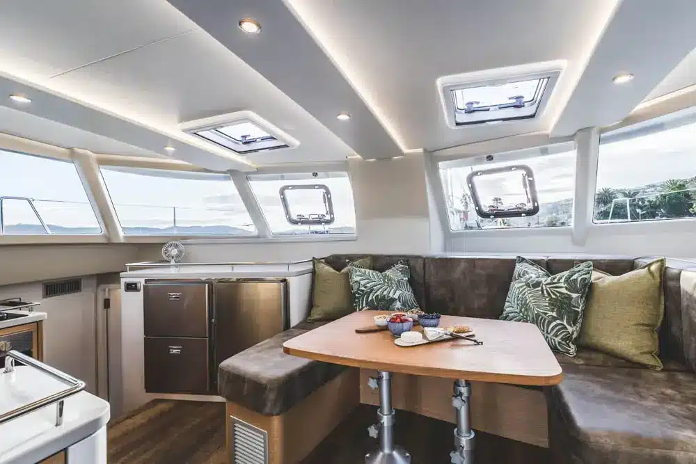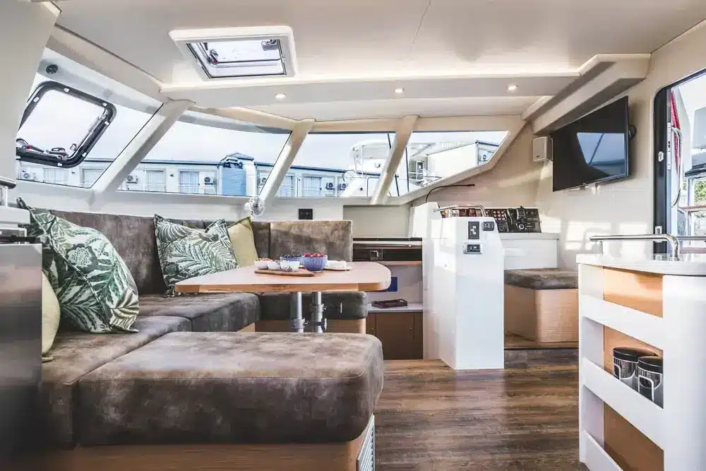 Wind sheltered cockpit flows seamlessly into the saloon for true indoor outdoor living. Every fixture is positioned for real life at sea with durable, easy to maintain components.