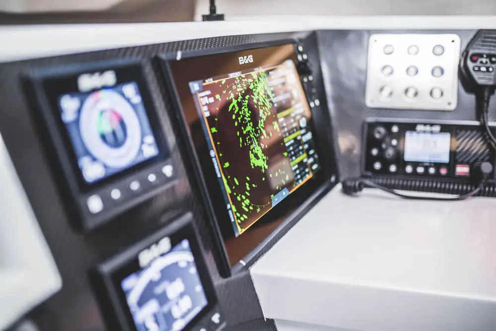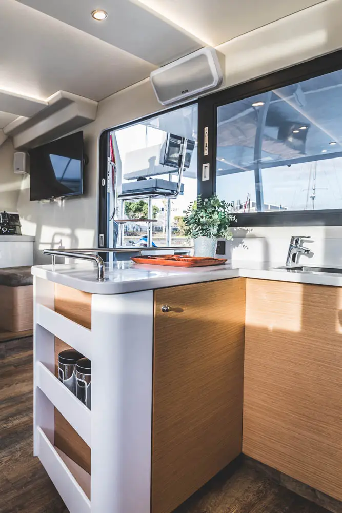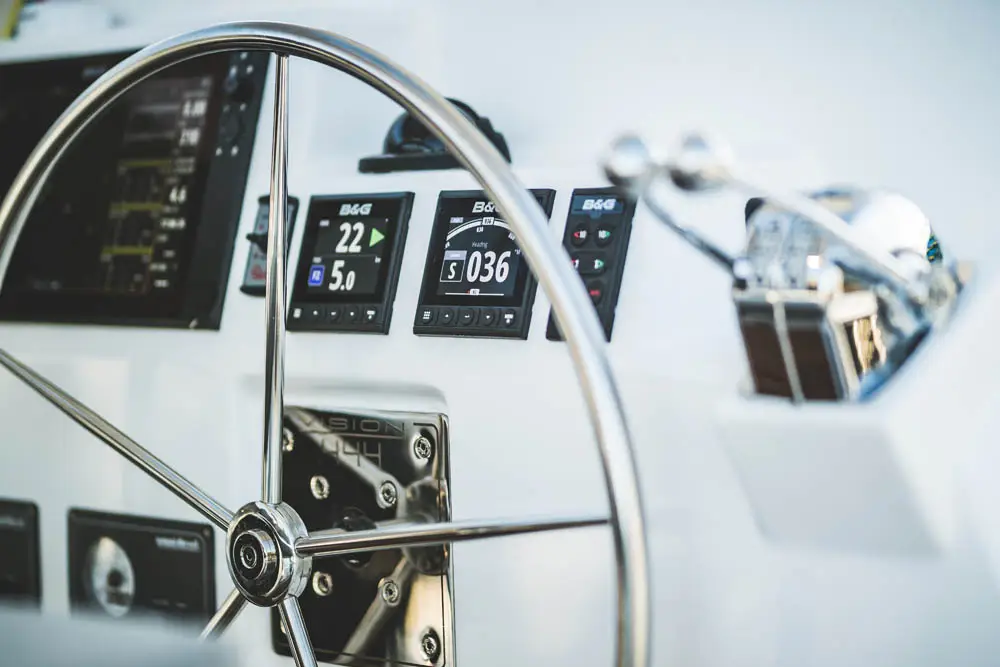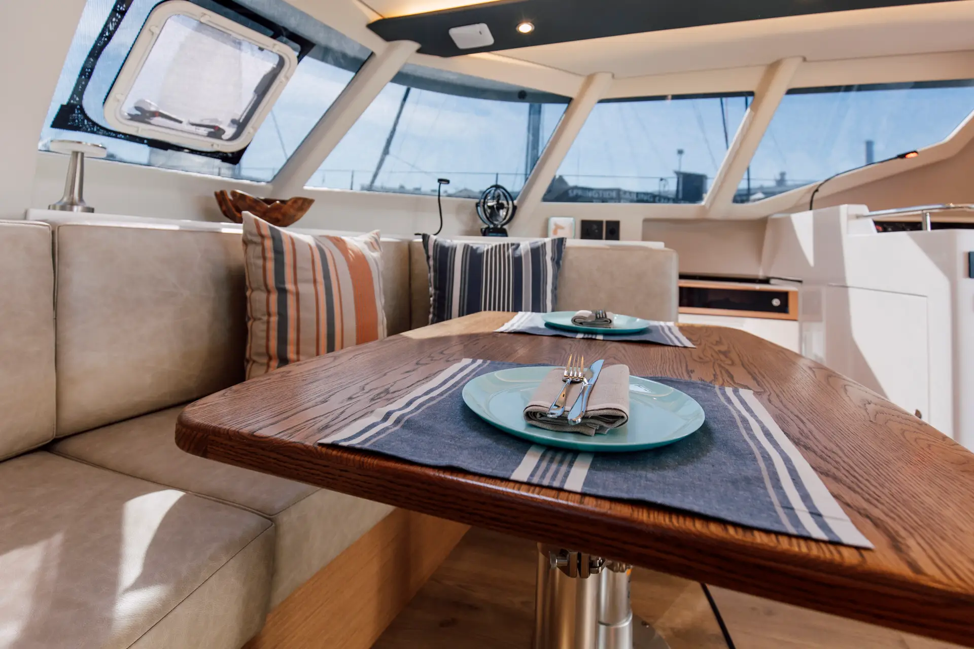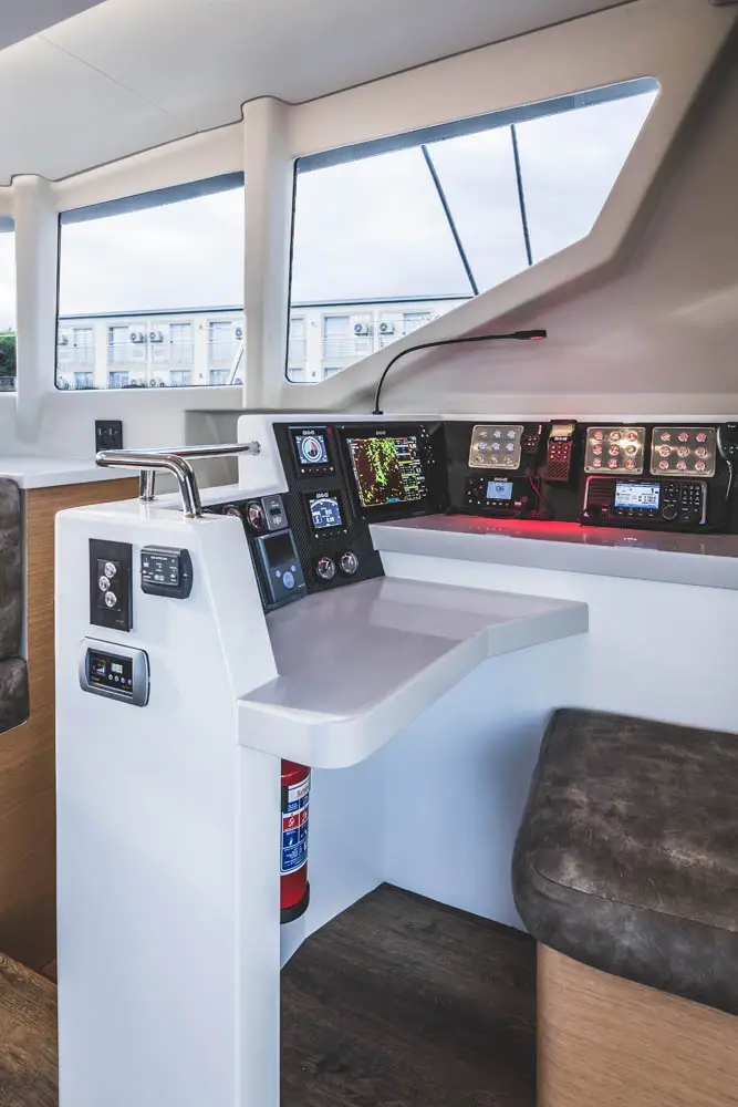 The helm is designed with the skipper in mind, featuring an elevated vantage point and a see-through roof above the steering position, allowing clear upward visibility of the sails and rigging – ideal for safe, precise navigation.