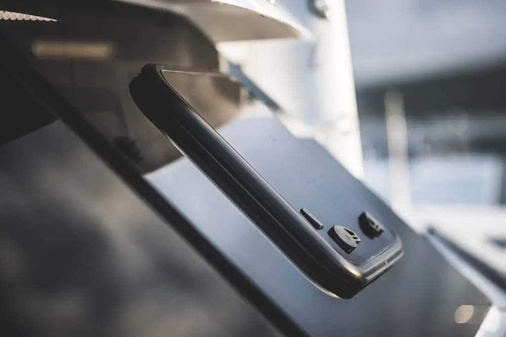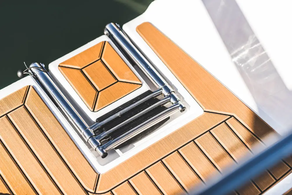 A unique gunwale access door allows easy boarding from a dock or tender, while the wind-sheltered layout invites sunbathing and socialising in total comfort.
